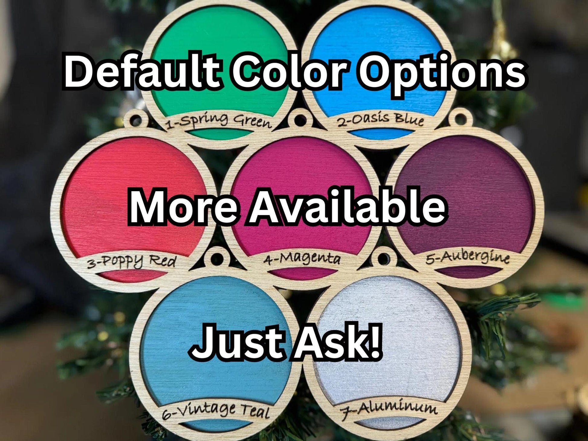 This item size will vary depending on the size you select in the options. It will be 1/4" thick and come with a small piece of twine to hang from your tree. We combine two layers of 1/8" plywood that allows for the color ring to be added.