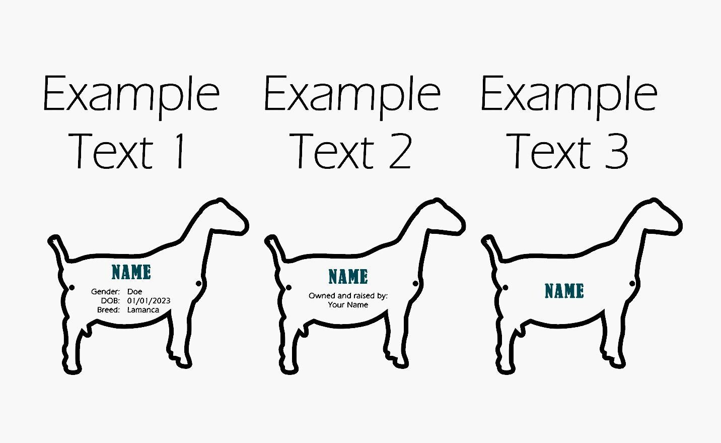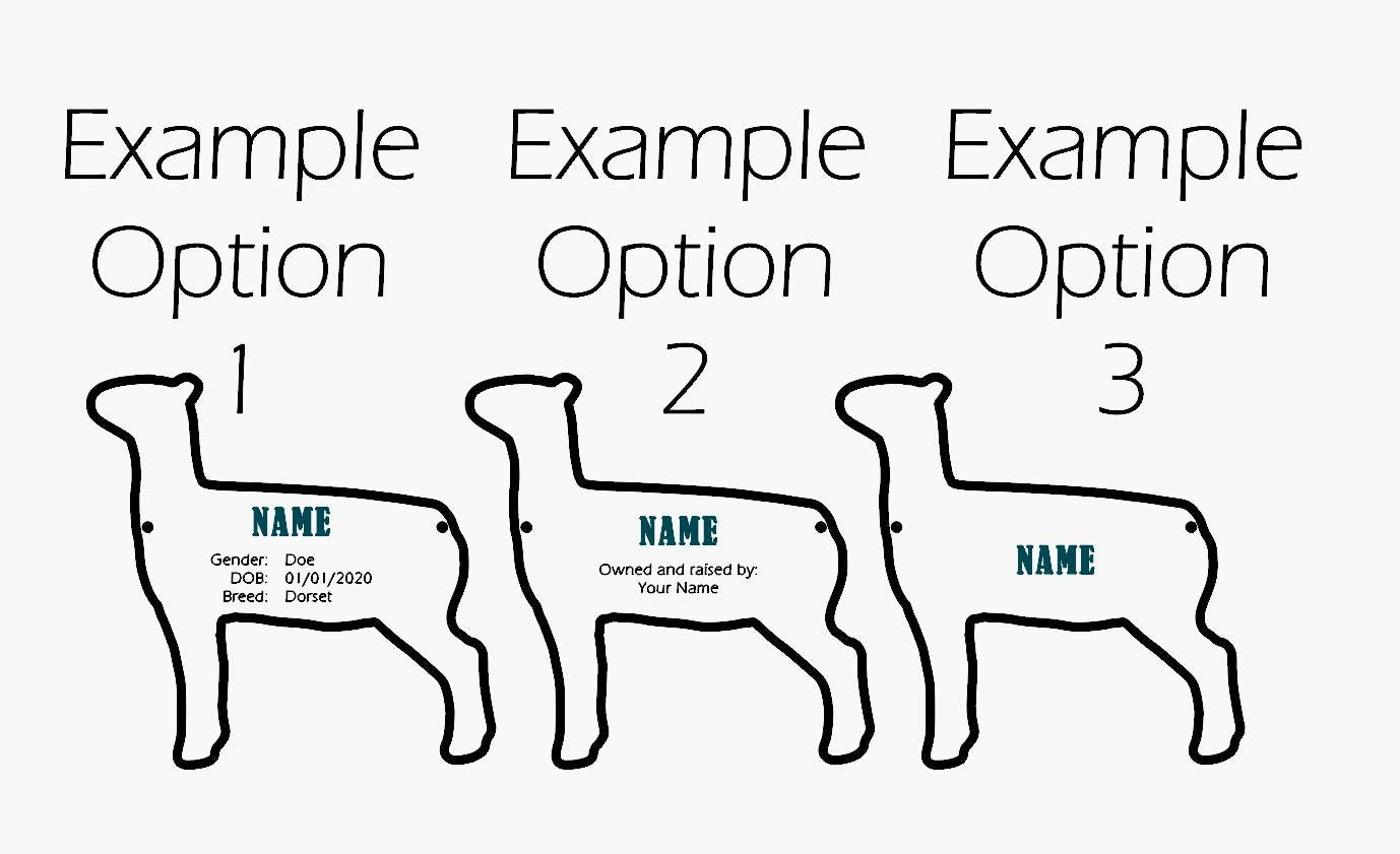 Text can be customized! We are pretty flexible on the text we can write on the stall tag, and we have some default examples in the pictures from another listing. We will try to match what you type as close as possible and will reach out if we have any questions! The topmost text line will be larger as seen in the photos. The Animal name will default to all caps and the other wording we will match your capitalization as typed in the personalization!