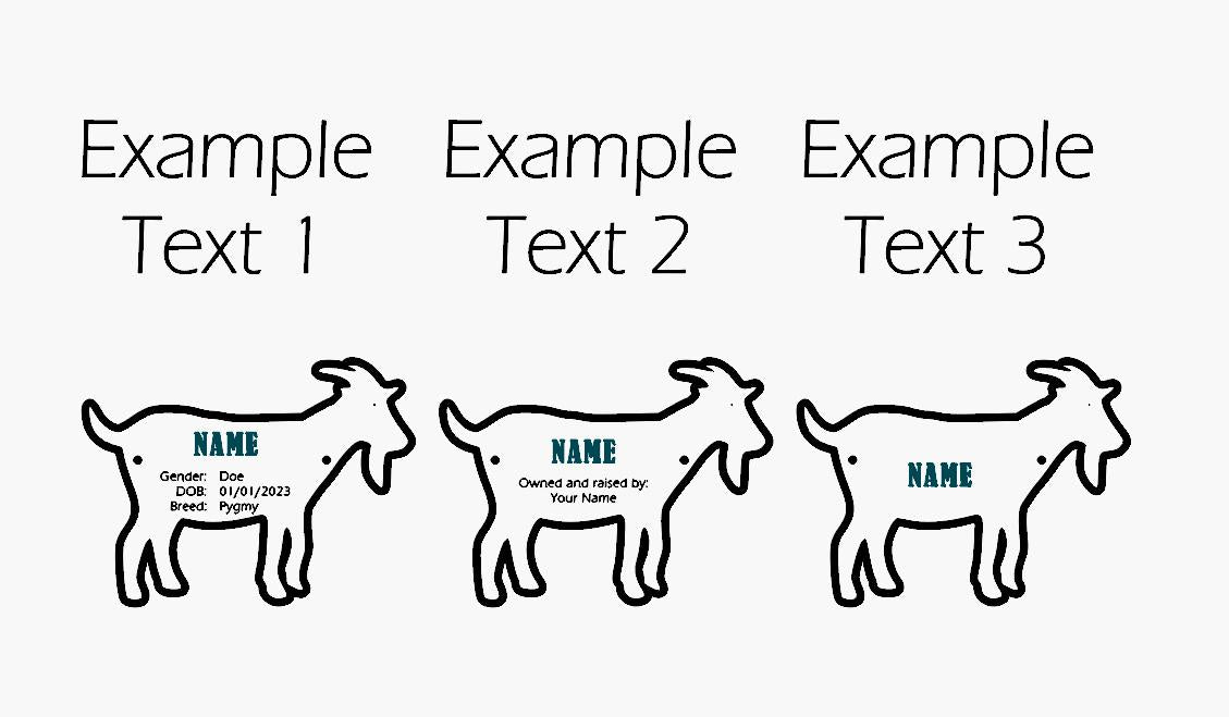 Text can be customized! We are pretty flexible on the text we can write on the stall tag, and we have some default examples in the pictures from another listing. We will try to match what you type as close as possible and will reach out if we have any questions! The topmost text line will be larger as seen in the photos. The Animal name will default to all caps and the other wording we will match your capitalization as typed in the personalization!